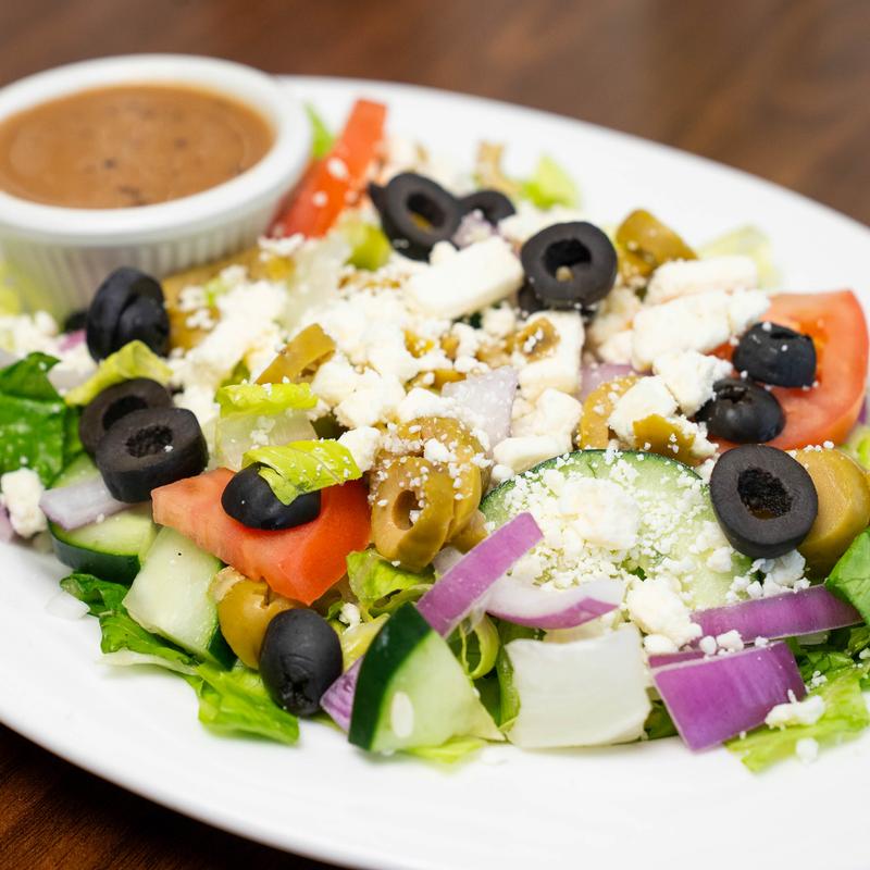 Lettuce, tomato, red onion, cucumber & feta cheese, olives & Greek dressing